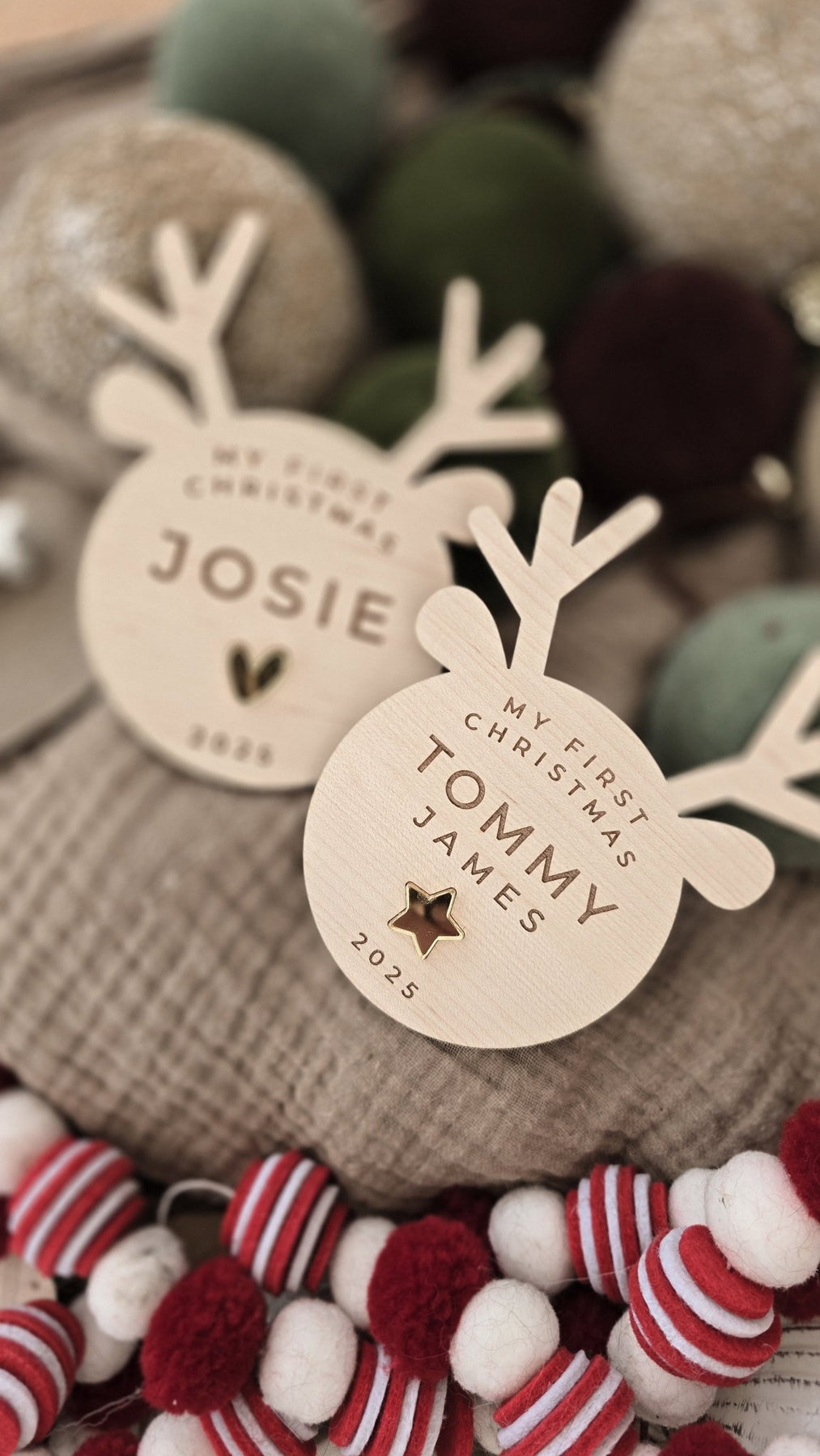 Each plaque features a sweet minimalist reindeer face outline and is engraved with “My First Christmas”, your baby’s name, and the year — creating a keepsake to treasure for years to come. Choose your reindeer’s nose style to suit your look: an engraved heart, engraved star, or a 3D gold acrylic nose for a festive sparkle.
