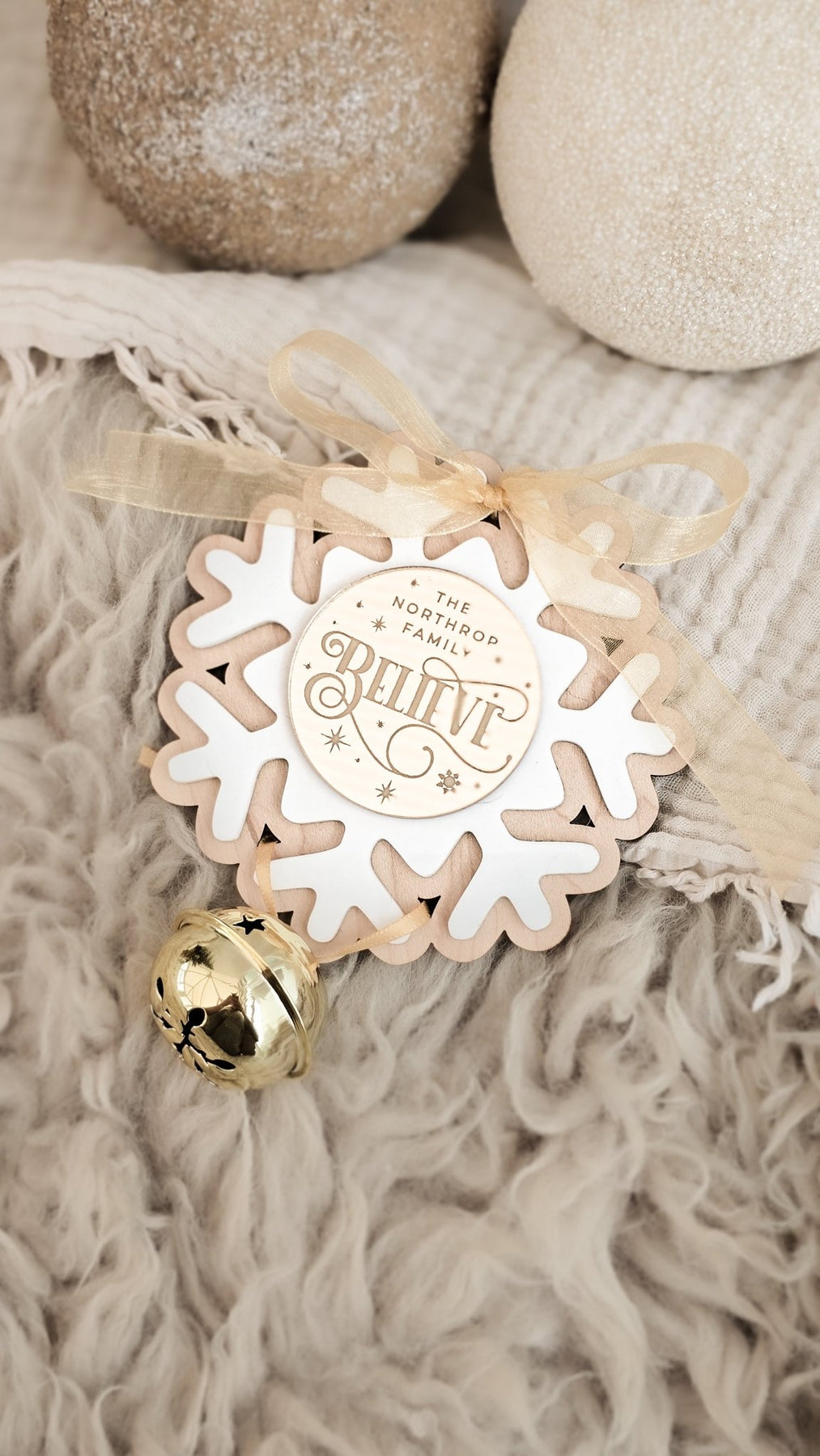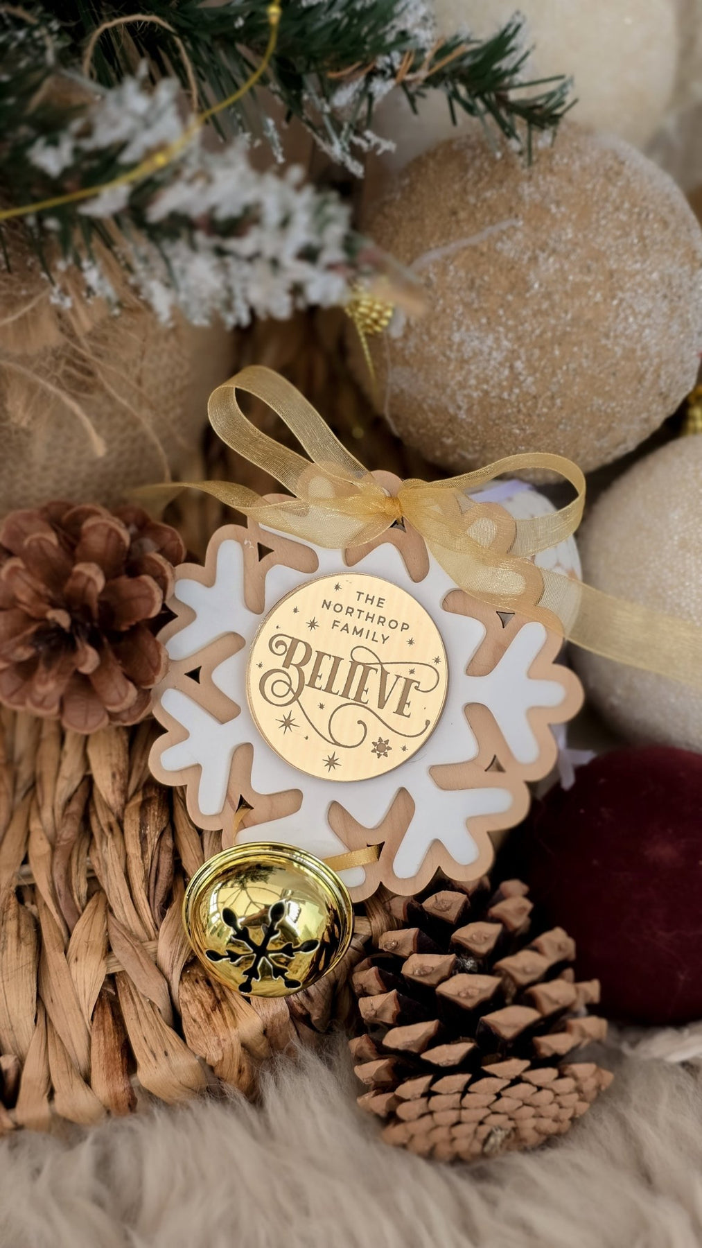 Bring a touch of festive elegance to your home with this Gold Believe Bell Ornament, blending luxury materials with timeless sentiment. Each ornament features a golden jingle bell, gold ribbon, and layered snowflake crafted from maple wood and white acrylic. The centre plaque is personalised with your chosen name and either Believe or Believes, engraved or finished in Gold, Silver, Maple, or Oak for a perfect match.