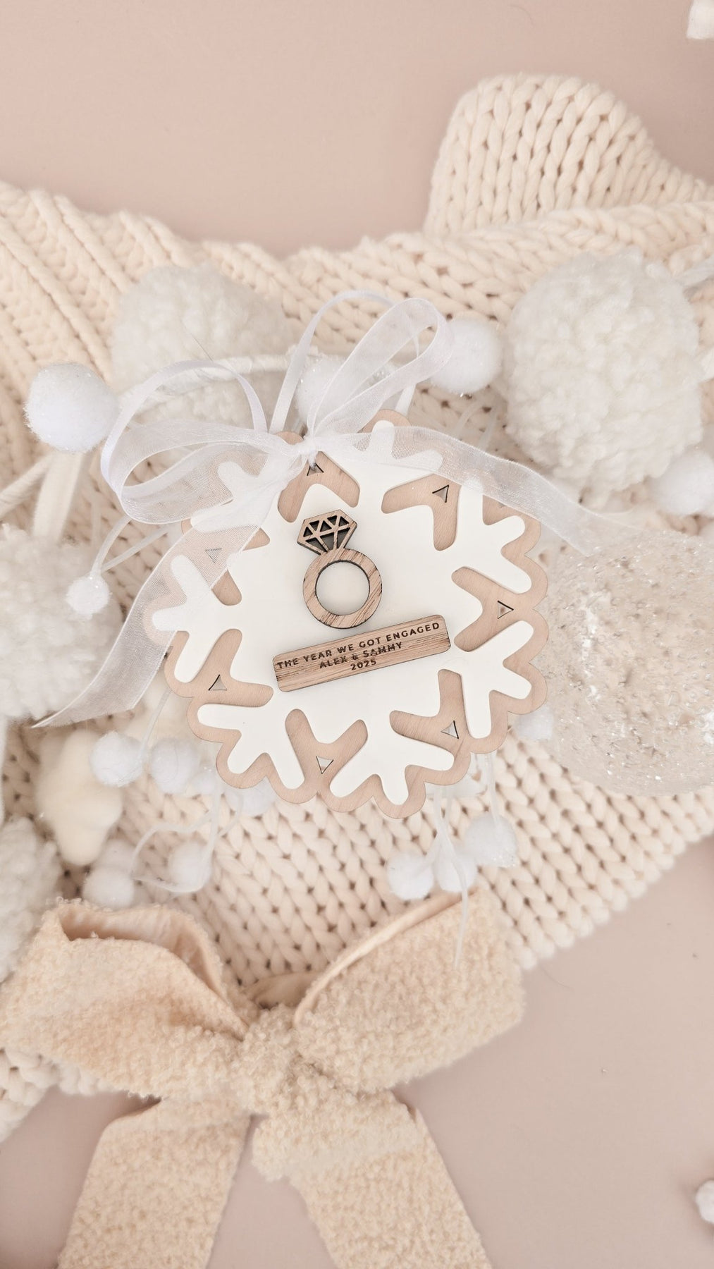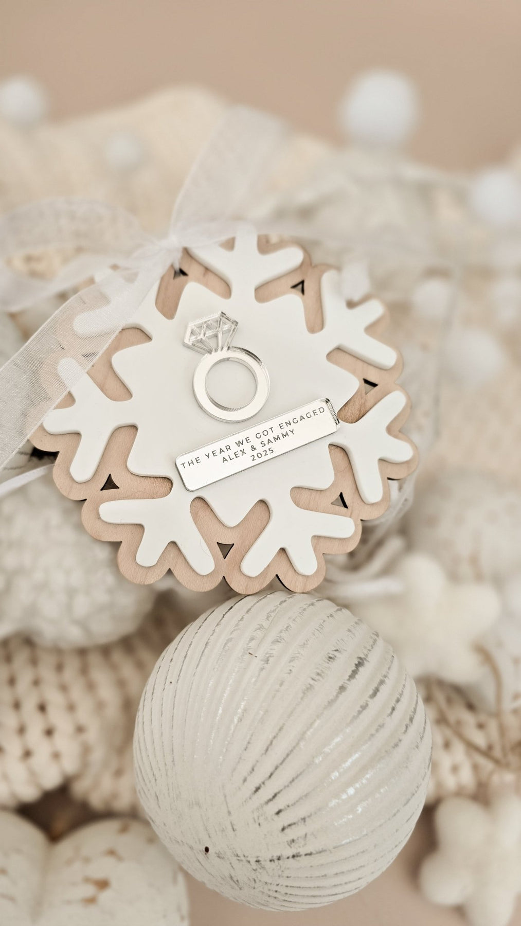 Each decoration comes complete with a ribbon of your choice – white, gold, red, or neutral gingham – making it ready to hang, gift, or treasure as a timeless memento of your engagement.